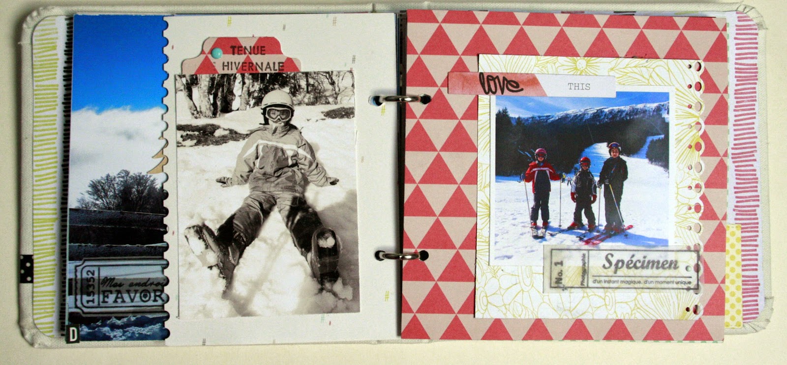Les petites montagnes, chalets et sapins présents sur quelques pages ont été découpé à la caméo. Pour ces pages, je me suis très largement inspirée d'un mini album trouvé l'avant dernier numéro d'Esprit Scrapbooking.